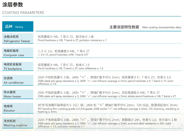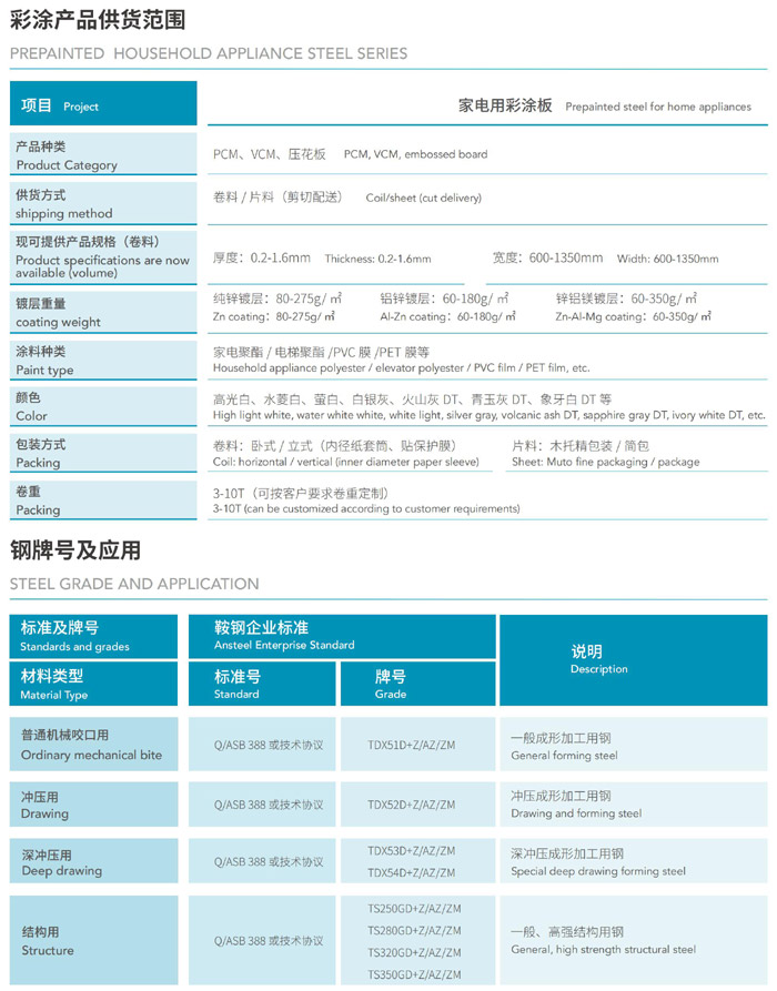 鞍鋼可生產厚度 0.2-1.6mm,寬度 600-1350mm 的鍍鋅、鍍鋁鋅,以及鍍鋅鋁鎂家電彩涂板,產品種類有 PCM、VCM、壓花等多個類別。目前兩條機組年產能達 30 萬噸,工藝裝備先進,具有 12 年以上彩涂家電板生產經驗,產品廣泛應用于冰箱冰柜、液晶電視、熱水器、微波爐、洗衣機、電梯等家電產品。