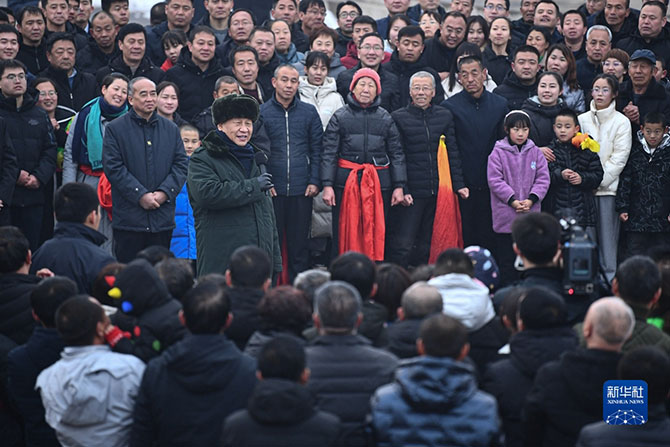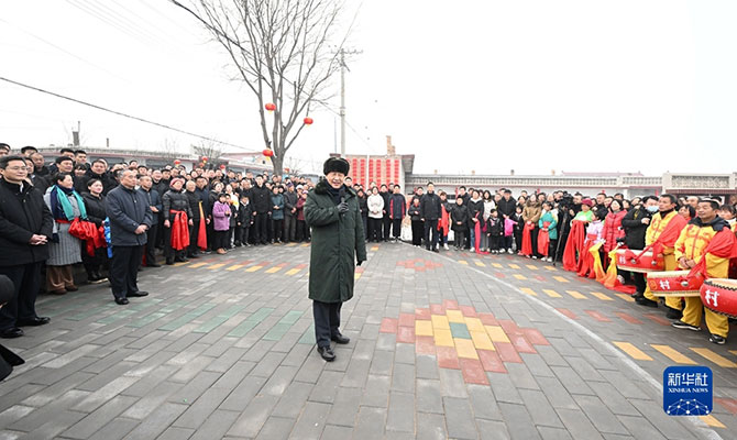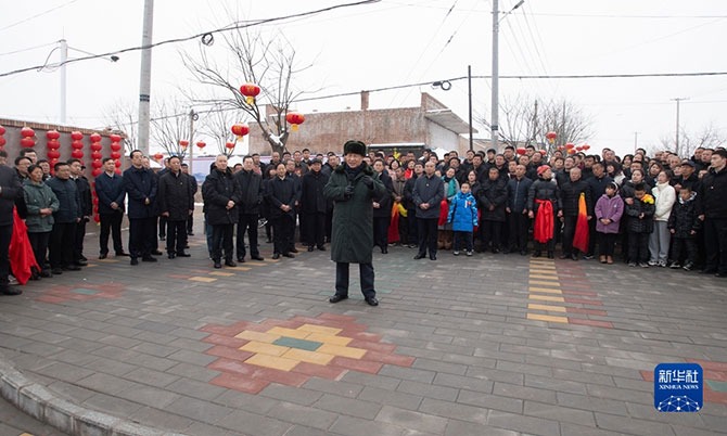村文化廣場上十分熱鬧,村民們打起威風(fēng)鑼鼓、扭起秧歌歡慶佳節(jié)。看到總書記來了,人們高興地歡呼起來。習(xí)近平對鄉(xiāng)親們說,我們黨的根本宗旨就是為人民群眾辦好事,為人民群眾幸福生活拼搏、奉獻(xiàn)、服務(wù)。我們?nèi)缙诖蜈A了脫貧攻堅戰(zhàn),如期實現(xiàn)了全面建成小康社會目標(biāo),現(xiàn)在踏上了全面建設(shè)社會主義現(xiàn)代化國家新征程。建設(shè)現(xiàn)代化國家離不開農(nóng)業(yè)農(nóng)村現(xiàn)代化,要繼續(xù)鞏固脫貧攻堅成果,扎實推進(jìn)鄉(xiāng)村振興,讓群眾生活更上一層樓,在推進(jìn)農(nóng)業(yè)農(nóng)村現(xiàn)代化中越走越有奔頭。