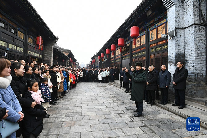 古城南大街年味濃郁。習(xí)近平沿街巷察看古城風(fēng)貌,走進(jìn)平遙牛肉店、推光漆器店、東湖老醋坊,了解當(dāng)?shù)匚幕z產(chǎn)保護(hù)利用和開展特色經(jīng)營情況,并購買了平遙牛肉、餃子醋等年貨,還參與了陳醋發(fā)酵打耙。他指出,要做優(yōu)秀傳統(tǒng)文化傳承者,保護(hù)好推光漆器等文化瑰寶,把富有民族特色的傳統(tǒng)文化產(chǎn)業(yè)發(fā)揚(yáng)光大、推向世界。現(xiàn)場群眾紛紛向總書記問好,習(xí)近平向大家揮手致意,給大家拜年。