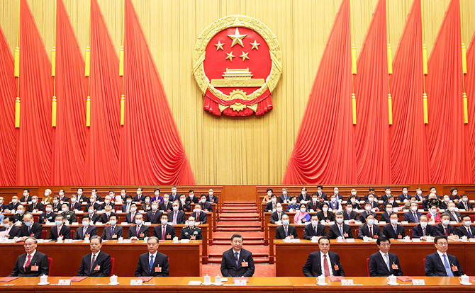 習(xí)近平、李克強(qiáng)、汪洋、王滬寧、趙樂(lè)際、韓正、王岐山和大會(huì)主席團(tuán)成員在主席臺(tái)就座。