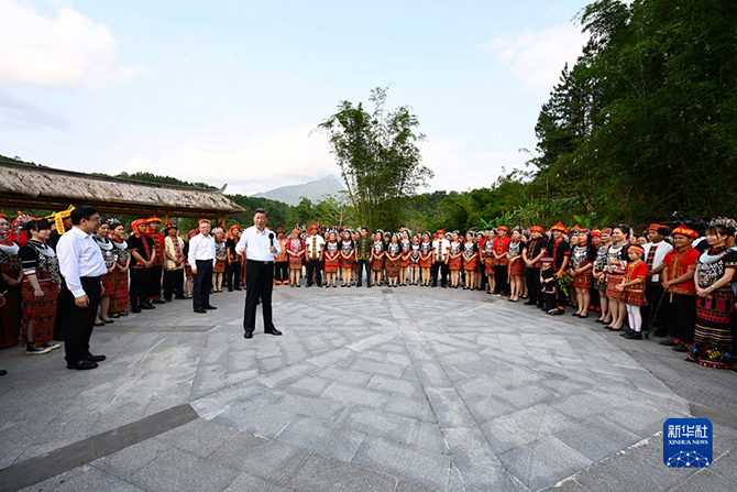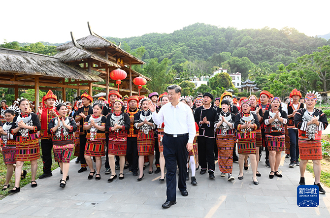 習近平沿長廊察看黎族特色農產品和黎錦、藤編等非物質文化遺產展示。廣場上,歌聲悠揚、鼓樂齊奏,村民們跳起竹竿舞迎接遠方的客人。習近平親切地對大家說,很高興來看望黎族鄉親們,看到你們過上幸福生活,我感到很欣慰。我們全面建成小康社會以后,還要繼續奔向全體人民共同富裕,建設社會主義現代化國家。鄉村振興要在產業生態化和生態產業化上下功夫,繼續做強做大有機農產品生產、鄉村旅游、休閑農業等產業,搞好非物質文化遺產傳承,推動鞏固拓展脫貧攻堅成果同鄉村全面振興有效銜接。各級領導干部要貫徹黨的群眾路線,牢記黨的根本宗旨,想群眾之所想,急群眾之所急,把所有精力都用在讓老百姓過好日子上。
