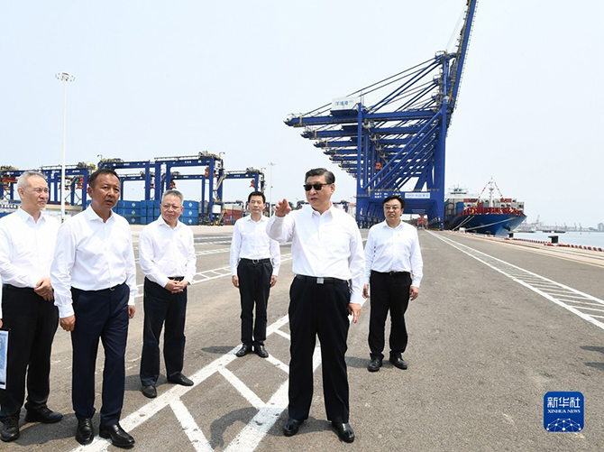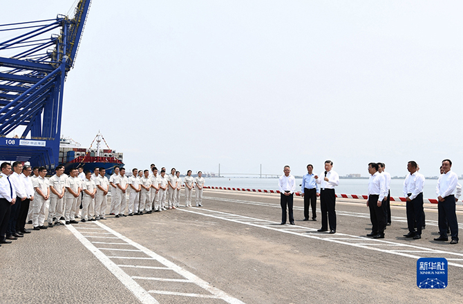隨后,習近平來到洋浦國際集裝箱碼頭小鏟灘港區,了解港口建設發展情況,同現場作業人員、掛職干部代表等親切交流。習近平強調,振興港口、發展運輸業,要把握好定位,增強適配性,堅持綠色發展、生態優先,推動港口發展同洋浦經濟開發區、自由貿易港建設相得益彰、互促共進,更好服務建設西部陸海新通道、共建“一帶一路”。他指出,黨中央選派干部來自由貿易港掛職,既體現了黨中央對自由貿易港建設的關心和支持,也是對干部的培養鍛煉,要發揮掛職干部的積極作用,讓他們在基層一線增長才干。