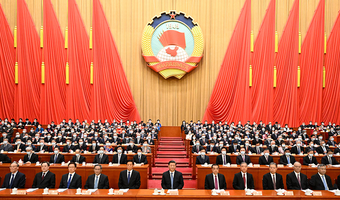 3月4日,中國人民政治協商會議第十四屆全國委員會第一次會議在北京人民大會堂開幕。這是習近平、李克強、栗戰書、汪洋、李強、趙樂際、韓正、蔡奇、丁薛祥、李希、王岐山在主席臺就座。新華社記者 李學仁 攝