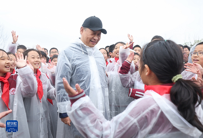 4月4日,黨和國家領導人習近平、李強、趙樂際、王滬寧、蔡奇、丁薛祥、李希、韓正等冒雨來到北京市朝陽區東壩中心公園參加首都義務植樹活動。這是植樹后,習近平同在場的中小學生親切交談。(新華社記者 鞠鵬 攝)