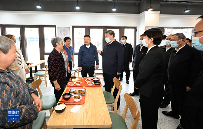 5月10日,中共中央總書記、國(guó)家主席、中央軍委主席習(xí)近平在河北省雄安新區(qū)考察,并主持召開高標(biāo)準(zhǔn)高質(zhì)量推進(jìn)雄安新區(qū)建設(shè)座談會(huì)。這是10日上午,習(xí)近平在容東片區(qū)南文營(yíng)社區(qū)食堂同就餐的社區(qū)老人親切交流。(新華社記者 李學(xué)仁 攝)