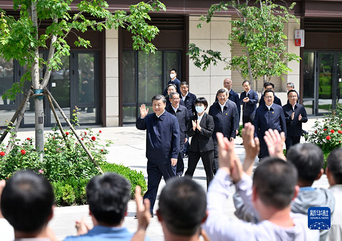 5月10日,中共中央總書記、國(guó)家主席、中央軍委主席習(xí)近平在河北省雄安新區(qū)考察,并主持召開高標(biāo)準(zhǔn)高質(zhì)量推進(jìn)雄安新區(qū)建設(shè)座談會(huì)。這是10日上午,習(xí)近平在容東片區(qū)南文營(yíng)社區(qū)考察時(shí)向社區(qū)居民揮手致意。(新華社記者 殷博古 攝)