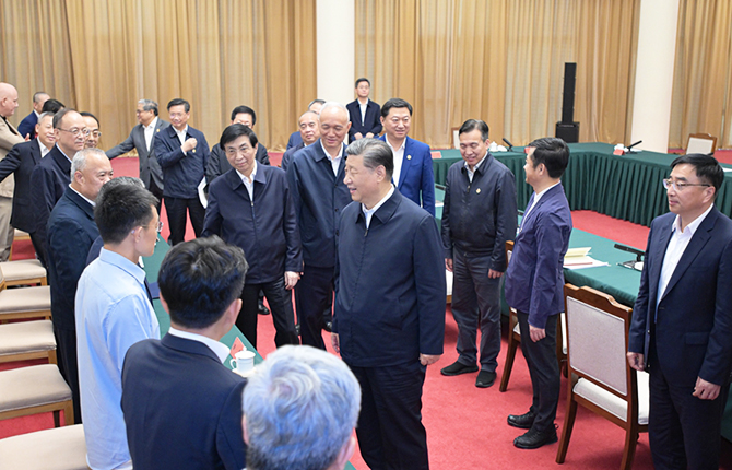5月23日下午,中共中央總書記、國家主席、中央軍委主席習近平在山東省濟南市主持召開企業和專家座談會并發表重要講話。這是習近平同參會的企業和專家代表親切交流。新華社記者李濤攝