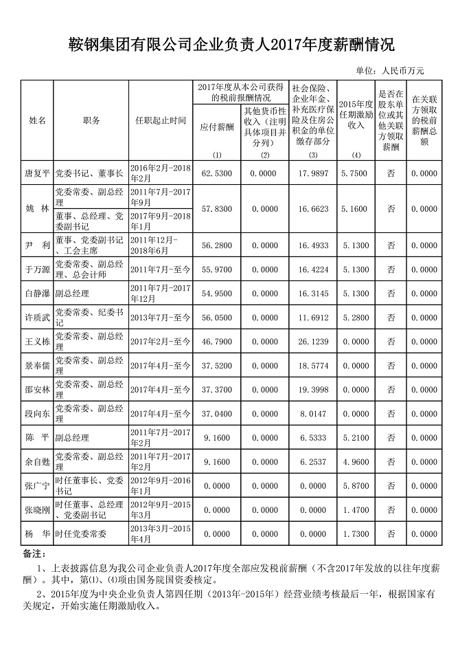 鞍鋼集團有限公司企業負責人2017年度薪酬情況