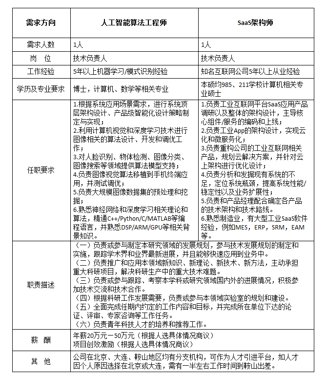 鞍鋼信息產業公司關于招聘高端技術人才的公告 根據鞍鋼集團信息產業有限公司發展戰略需求,為支撐公司機器視覺、工控安全、人工智能、云平臺技術研究等業務發展,現面向社會招聘高端專業技術人才,具體公告如下: